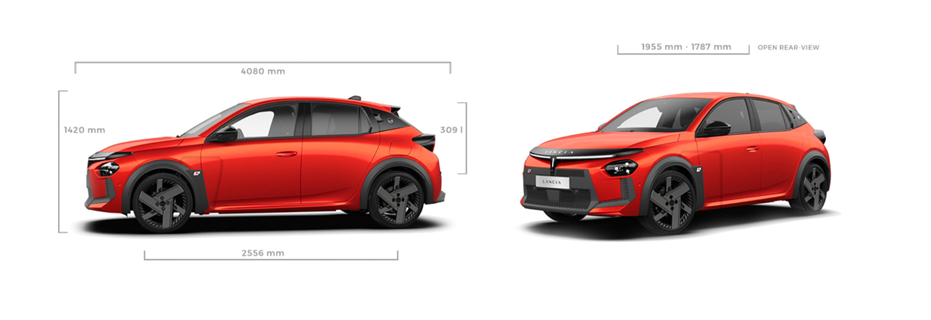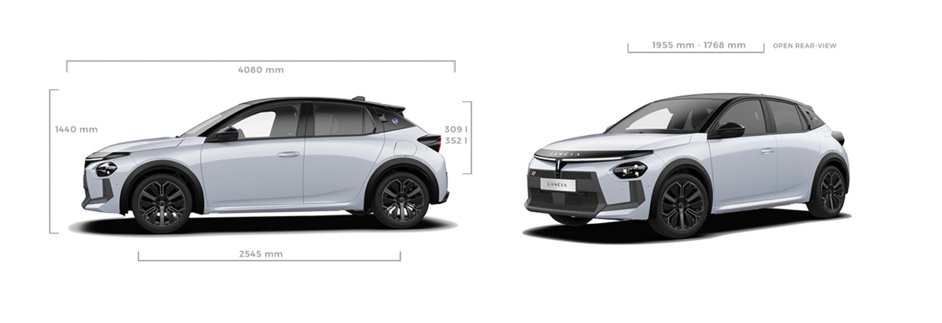 La nouvelle Ypsilon HF Line affiche des dimensions compactes et bien équilibrées, idéales pour une utilisation en milieu urbain. Avec une longueur de 4 080 mm et une largeur de 1 768 mm (1 995 mm rétroviseurs déployés), elle conserve une silhouette élancée tout en offrant une grande agilité dans les rues étroites.