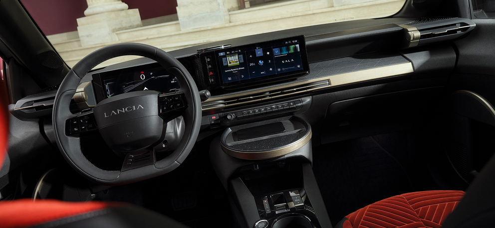 La face avant réinterprète la calandre emblématique de Lancia, le calice, avec trois faisceaux à LED pour une reconnaissance aisée.
